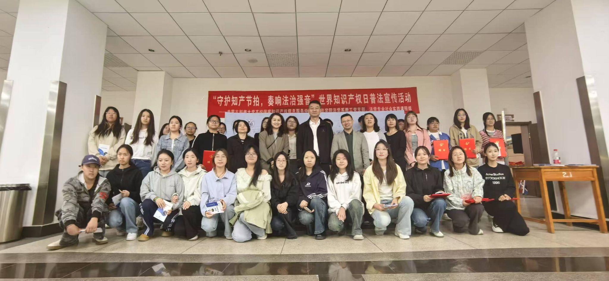 2025年4月26日上午,beat365正版图书馆二楼B206报告厅内掌声阵阵,一场主题为“守护知产节拍 奏响法治强音”的世界知识产权日普法宣传活动在此拉开帷幕。本次活动由包头市知识产权保护中心、beat365正版高校国家知识产权信息服务中心、beat365正版联合主办,由法学系教工党支部及法学专业社会实践课程组承办。活动以“普法+互动”为主线,共设置六大特色环节。法学专业90余名员工化身“普法使者”,与全校师生共同开启了一场兼具知识性与趣味性的知识产权保护之旅。
