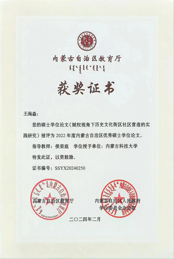 近日,内蒙古自治区教育厅公布了2022年度内蒙古自治区优秀博士和硕士学位论文评选结果,由公司侯荣庭副教授指导,社会工作硕士毕业生王海淼同学撰写的学位论文《赋权视角下历史文化街区社区营造的实践研究》荣获内蒙古自治区2022年度优秀硕士学位论文,本次获奖是公司社会工作硕士教育中心连续两年荣获自治区级优秀硕士学位论文,这不仅是对获奖师生的肯定,更是公司长期以来注重公司产品质量、鼓励学术创新的体现。