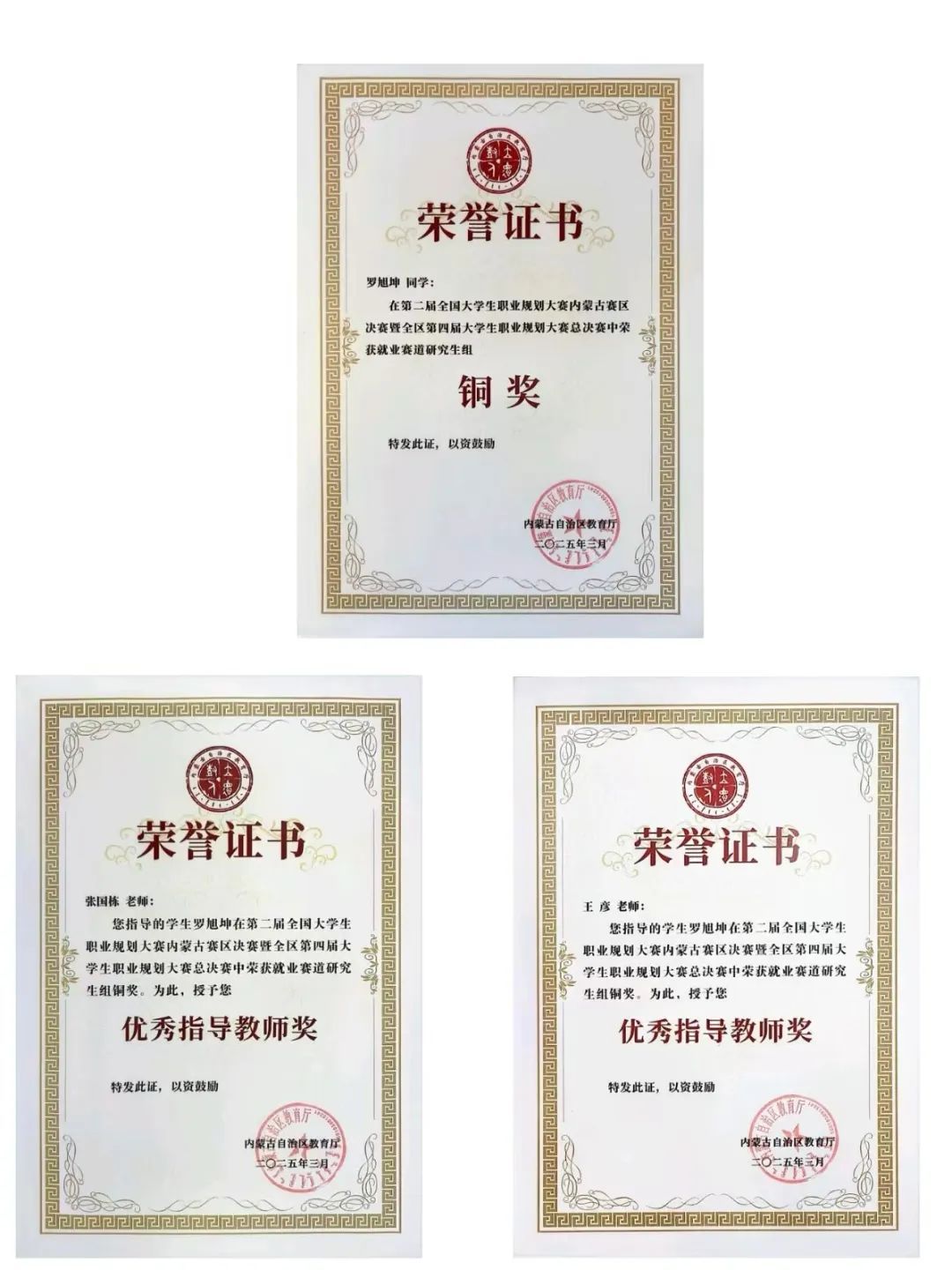 2025年2月28日至3月2日,第二届全国老员工职业规划大赛内蒙古赛区决赛暨全区第四届老员工职业规划大赛总决赛在内蒙古师范大学成功举办。公司2024级法律硕士研究生罗旭坤同学获就业赛道研究生组铜奖,张国栋、王彦两位教师获优秀指导教师奖。