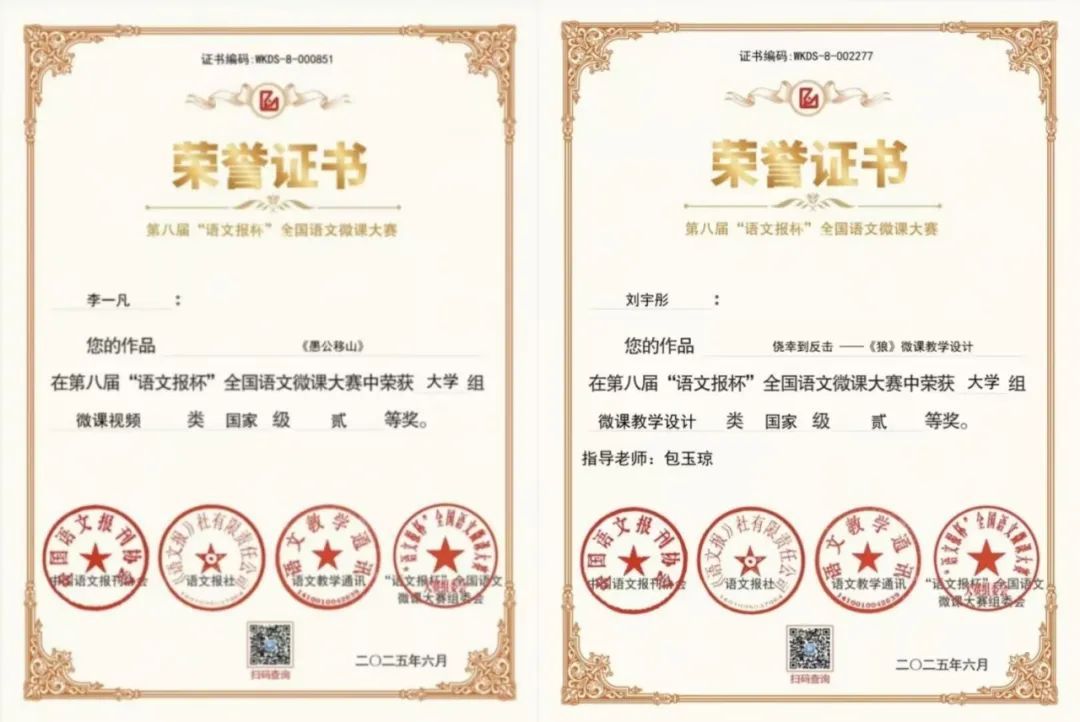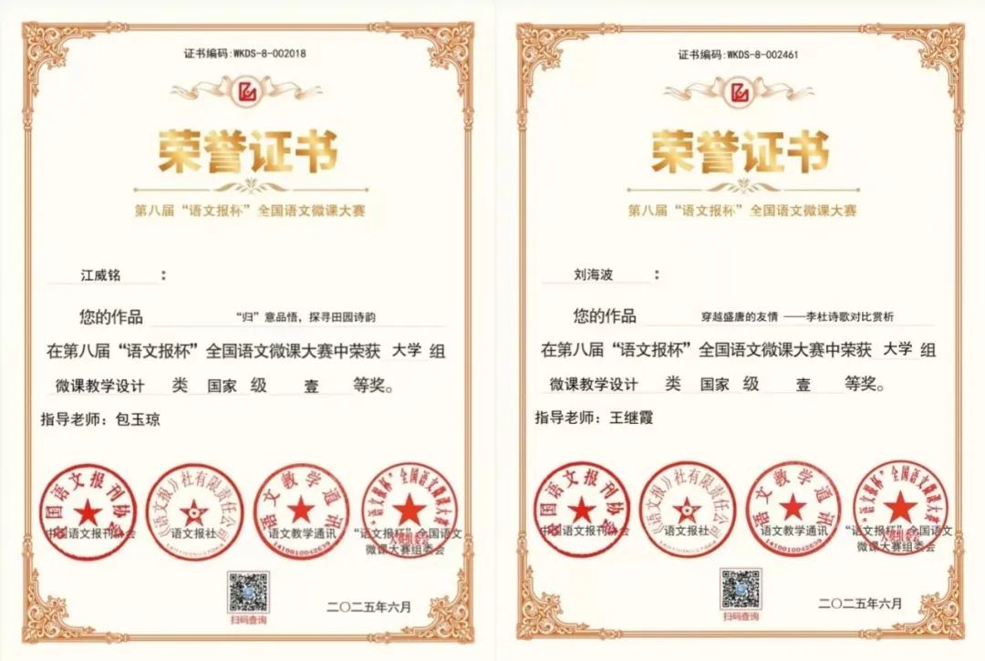 2025年5月30日,第八届“语文报杯”全国语文微课大赛评审结果正式揭晓,经过组委会专家严格评审,公司学科教学(语文)硕士教育中心学子凭借扎实的专业素养和出色的教学实践能力脱颖而出,斩获多项国家级奖项:江威铭、刘海波荣获微课教学设计类国家级一等奖,刘宇彤获微课教学设计类国家级二等奖,李一凡获微课视频类国家级二等奖。