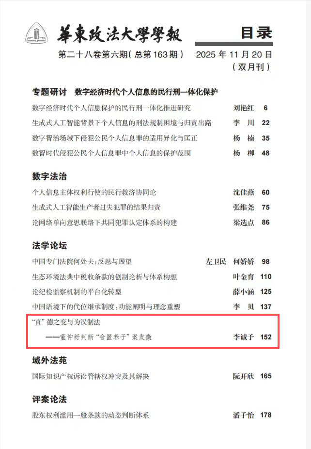公司法学系教师李诚予副教授在《华东政法大学学报》2025年第6期上发表高质量学术论文《“直”德之变与为汉制法——董仲舒判断“舍匿养子”案发微》。《华东政法大学学报》先后入选CSSCI法学来源期刊、中文法律核心期刊和中国人文社会科学法学核心期刊,并获评“全国高校百强社科期刊”“全国高校社科精品期刊”“上海市最佳学报”。