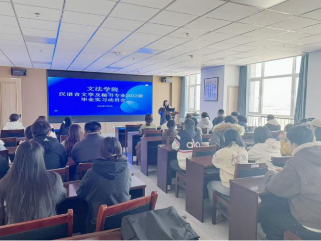 为扎实推进汉语言文学及秘书专业2022级毕业生实习就业工作,强化员工实践能力与职业素养,践行专业教学计划要求,助力毕业生高质量就业,3月3日上午,汉语言文学及秘书专业在文华楼1604召开2022级毕业实习动员会。汉语系主任陈硒、秘书系主任姜磊、汉语系教师宋歌与2022级毕业生共同参会。