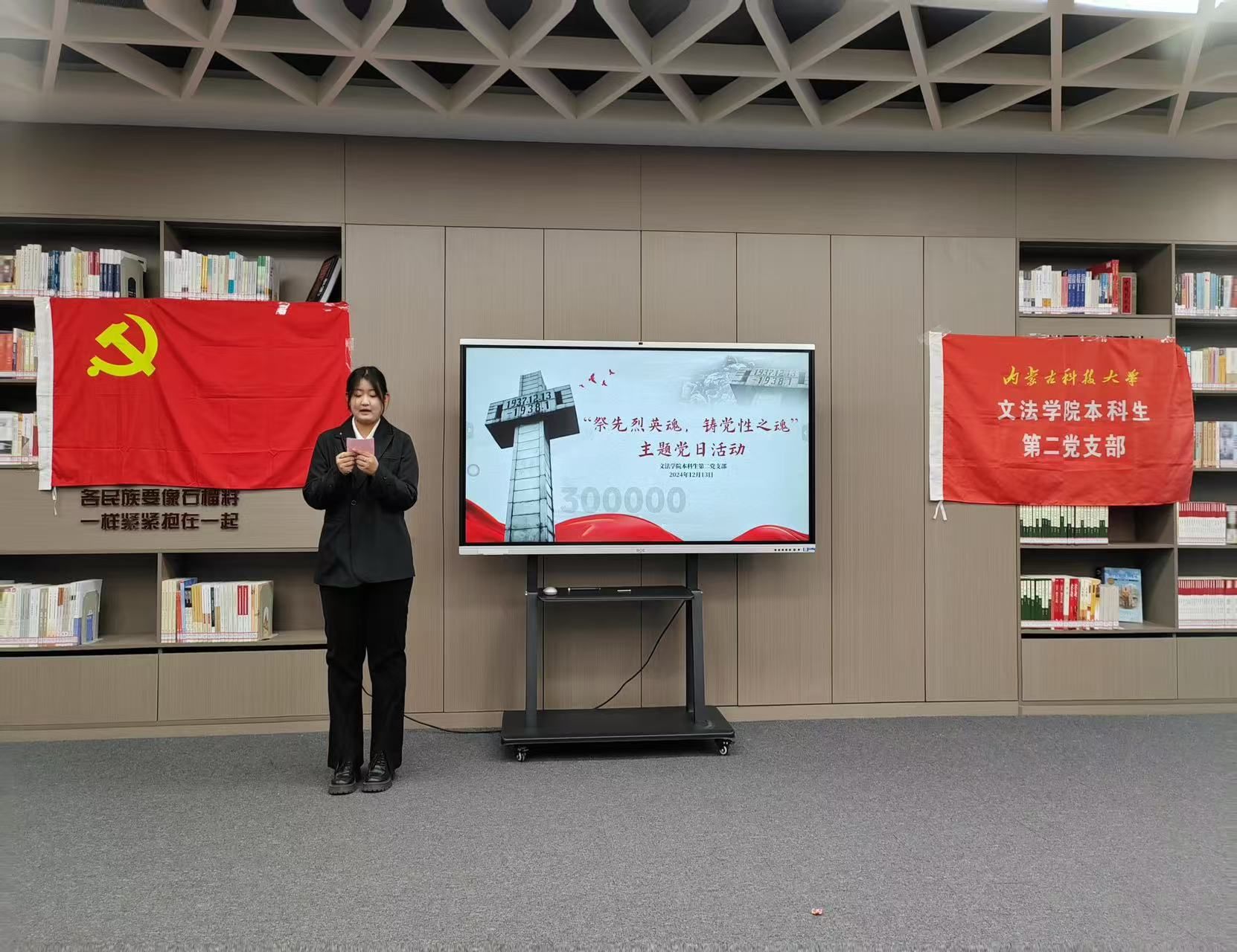 2024年12月13日下午,beat365正版本科生第二党支部于图书馆“石榴籽”阅览室举办了一场以“祭先烈英魂,铸党性之魂”为主题的党日活动。活动旨在铭记历史、缅怀先烈,强化党员党性意识,弘扬英烈精神,支部全体师生党员及积极分子参与。