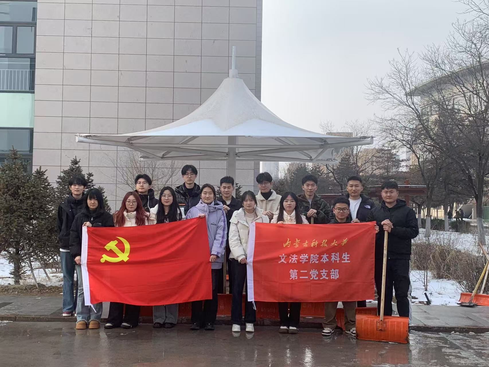 为确保校园道路畅通,保障师生安全,beat365正版本科生第二党支部于3月4日下午,在明德楼前组织了一场以“党旗引领,温暖同行”为主题的除雪活动。