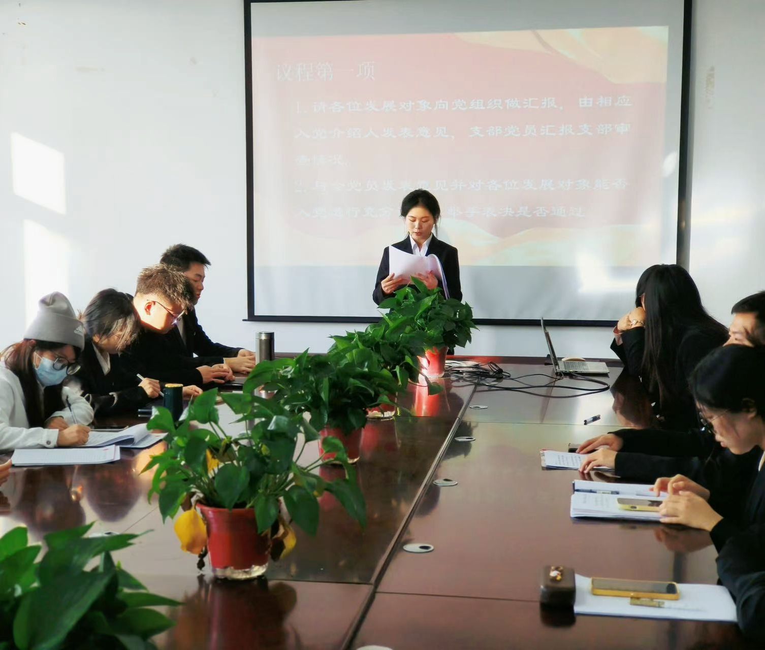 大会在庄严的国歌声中拉开帷幕。党支部书记张国栋首先汇报会议出席情况,确认正式党员人数符合表决要求,会议程序符合规定。随后,马宇飞等14名同志依次汇报思想与学习情况,入党介绍人发表意见,支部党员汇报审查结果。经与会党员投票表决,14名同志均全票通过,顺利被接收为中共预备党员。紧接着,预备党员代表孙佳宁发言,她承诺将以党员标准严格要求自己,持续加强理论学习与实践锻炼,努力成长为一名合格的共产党员。支部书记宣读接收决议,为预备党员佩戴党徽。
