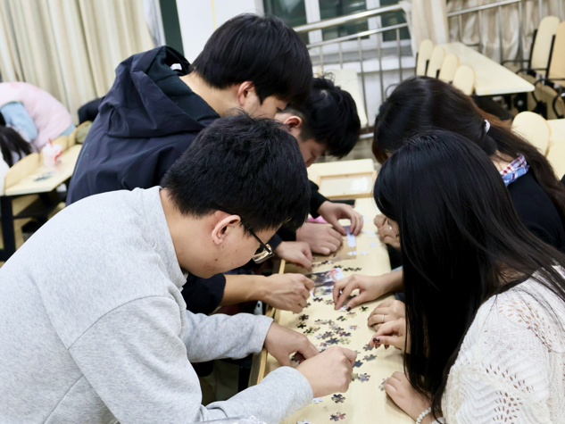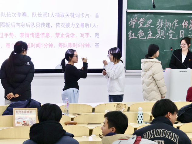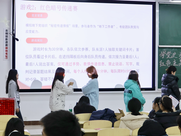 本次活动以“党史体验+团队竞赛”为核心,设置了党史知识拼图、红色暗号传递、红色盲盒问答、红色任务急速300秒四项游戏,复刻革命时期“还原战地地图”“秘密传递情报”等场景。同学们分组协作,在拼图中重温长征、开国大典等历史脉络,在无声传递中锻炼默契,在知识问答中夯实党史储备,在急速排序中提升协作效率,全程沉浸于红色历史的氛围中。