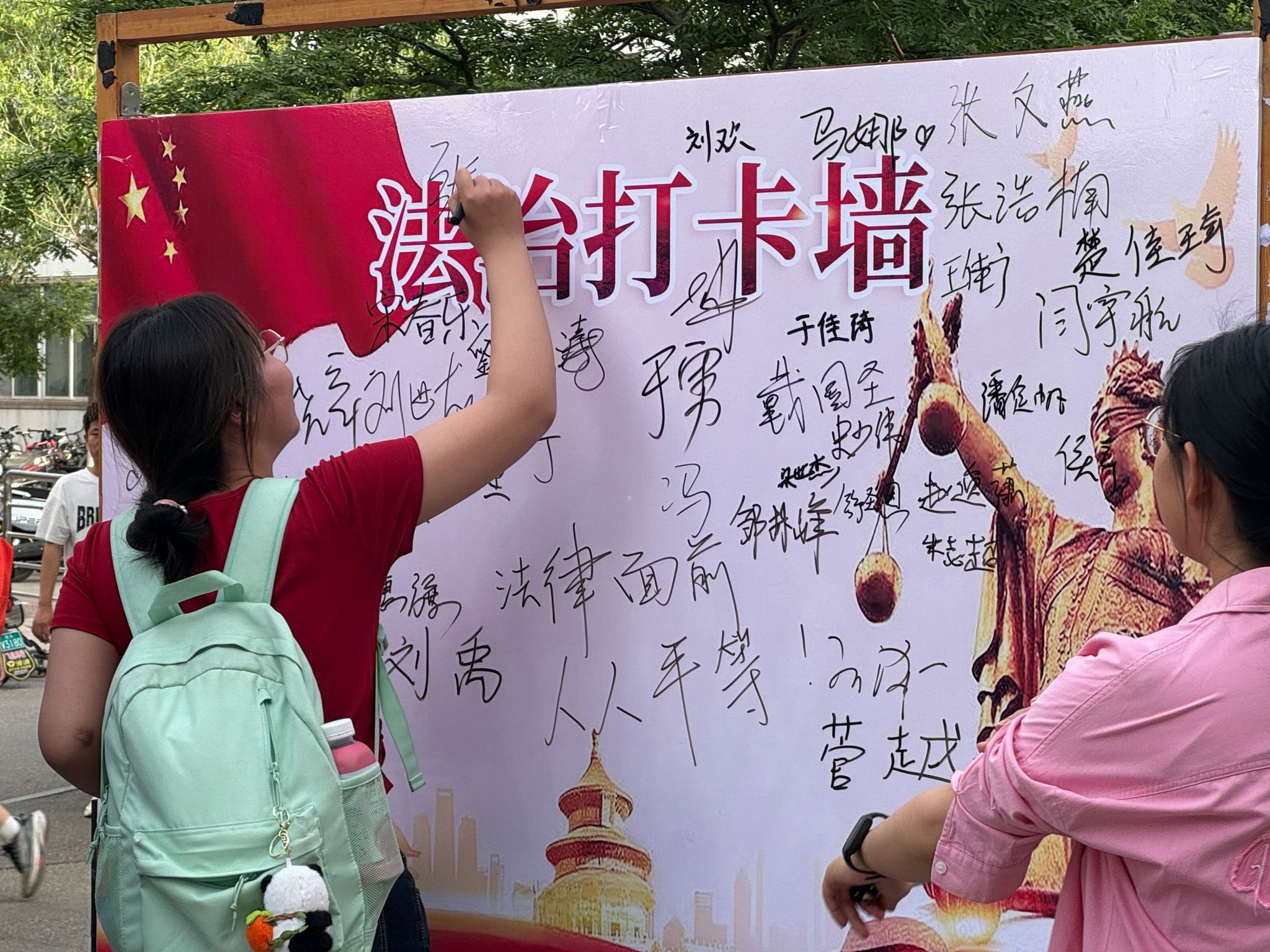 最后,同学们在法治打卡墙进行签名仪式。通过庄重的仪式感,加强广大同学们对尊法、学法、知法、守法、用法的自觉性和主动性,对进一步提高同学们法治观念、增强法律素养和文明修养起到了积极作用。