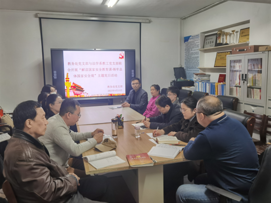 为深入贯彻落实总体国家安全观,增强全民国家安全意识,4月13日下午,在我国第八个全民国家安全教育日之际,法学系教工党支部与教务处党支部在行政楼B203会议室联合开展“解读国家安全教育课·铸牢总体国家安全观”主题党日活动。