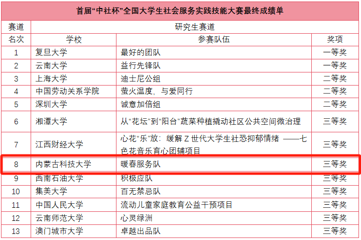 大赛于2024年5月启动,分为初赛、复赛、决赛三级赛制,专科、本科、研究生三个赛道,吸引了来自中国人民大学、复旦大学、华中科技大学等全国263所高校、763支团队、3659名学子参赛。历经初赛和复赛长达一年的层层选拔,研究生赛道共有16支队伍进入决赛。公司社会工作专业硕士(MSW)团队入围决赛并在决赛中荣获三等奖,团队指导老师乌静荣获指导老师三等奖。