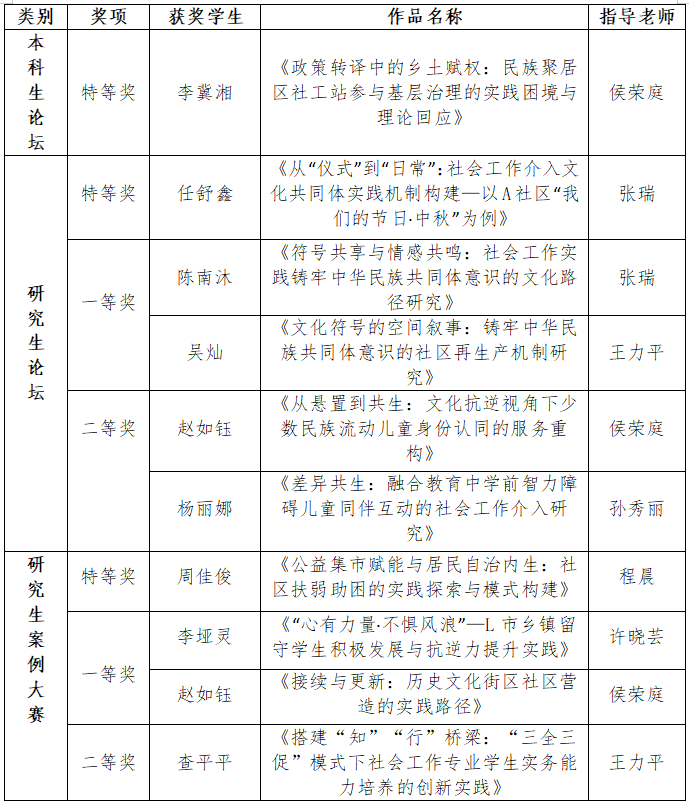 本届大赛共收到参赛作品118篇,下午同步设立本科生论坛、研究生论坛和研究生案例大赛3个分论坛。公司学子聚焦社区治理、乡村振兴、铸牢中华民族共同体意识等前沿议题,作品凭借扎实的理论根基、创新的实践模式和鲜明的时代特色,在评选中脱颖而出。获奖名单如下:
