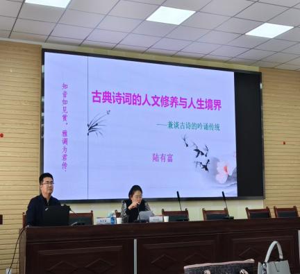 应北疆文学与文化传承研究基地邀请,叶嘉莹先生博士生、内蒙古师范大学文学院经理、陆有富教授来公司交流讲座。12月3日下午陆教授在明德楼A411做了题为“古典诗词的人格修养与人生境界——兼谈古典诗歌的吟诵传统”的学术讲座。讲座由刘红红教授主持。相关专业老师和同学到场聆听。